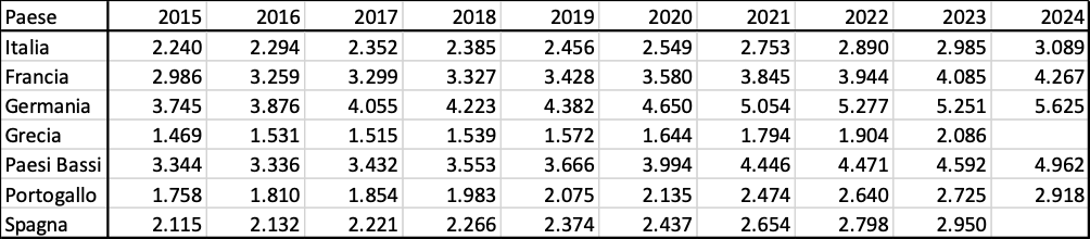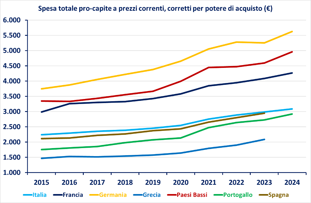 In questo contributo si propongono alcune delle informazioni disponibili in proposito, per Italia, Francia, Germania, Grecia, Paesi Bassi, Portogallo e Spagna (cioè i paesi considerati nella relazione della Corte), per il decennio 2015-2024, per la spesa a prezzi correnti (cioè che non tengono conto dell’inflazione) però corretti per il potere di acquisto (altrimenti il confronto tra nazioni sarebbe del tutto discutibile), sul presupposto da una parte che i dati riportati nella relazione della Corte dei Conti siano corretti (del che non si dubita ma un po’ di prudenza è sempre meglio metterla sul tavolo quando i sistemi informativi sono diversi), dall’altra che siano affidabili (soprattutto per quanto riguarda i valori della spesa privata), e dall’altra ancora che i confronti numerici tra nazioni europee non siano sostanzialmente influenzati da fattori (ad esempio: locali) di cui la Corte non ha tenuto conto nel momento in cui ha pubblicato i suoi dati.